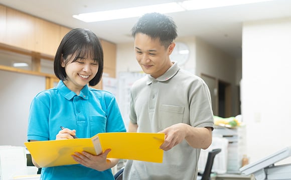 プリセプター制度 新人職員には先輩職員が一人付き、一定期間マンツーマンで技術や知識を丁寧に指導します。何でも相談できる身近な存在として見守ってくれるので、未経験でも安心です。仕事の習熟度は職員一人ひとり違いますので、一人立ちまでの期間は個々の状況に合わせて調整しています。焦らず自分のペースで頑張ってください。