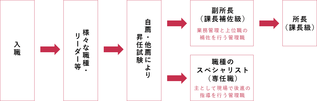 管理職の道筋は、事業所の運営や業務管理を担う「課長補佐」(ジェネラリスト)と法人全体の職種管理や現場の後進育成を担う「専任職」(スペシャリスト)がありますので、自分に合った道筋を選ぶこともできます。